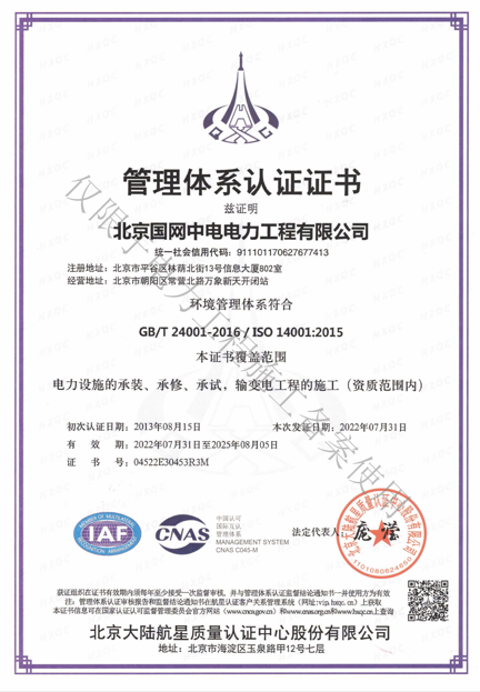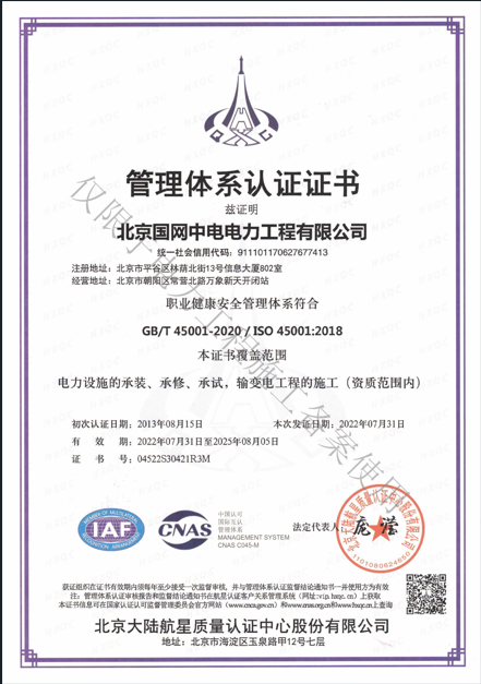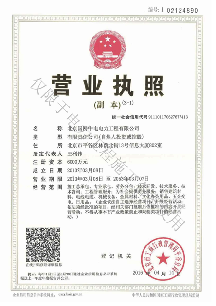 北京國(guó)網(wǎng)中電電力工程有限公司,已取得國(guó)家電監(jiān)會(huì)頒發(fā)的《承裝(修、試)電力設(shè)施許可證》、為電力施工承裝四級(jí)、承修四級(jí)、承試四級(jí)企業(yè)。北京市住房和城鄉(xiāng)建設(shè)委員會(huì)頒發(fā)的房屋建筑施工總承包二級(jí)、機(jī)電設(shè)備安裝工程專(zhuān)業(yè)承包二級(jí)、輸變電專(zhuān)業(yè)承包二級(jí)、城市及道路照明工程專(zhuān)業(yè)承包二級(jí)、市政公用工程總承包二級(jí)資質(zhì)、勞務(wù)不分等級(jí),已通過(guò)ISO9001:2015 GB/T50430-2017質(zhì)量管理體系、GB/T24001-2016/ISO 14001:2015環(huán)境管理體系、